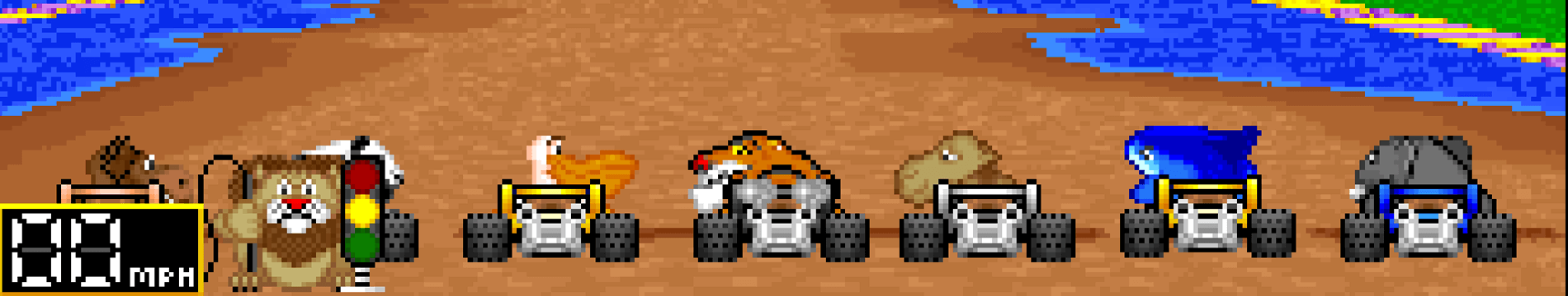 This game bears a striking resemblance to Super Mario Kart from the Super NES, but with a unique twist—instead of traditional karts, players ride around in amusing lawn mowers, and the racers are quirky animals from a zoo.